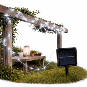 10 Méteres napelemes LED fényfüzér 100 hidegfehér leddel – kültéri dekorációs világítás kertbe, teraszra és erkélyre (FX) (BBV)