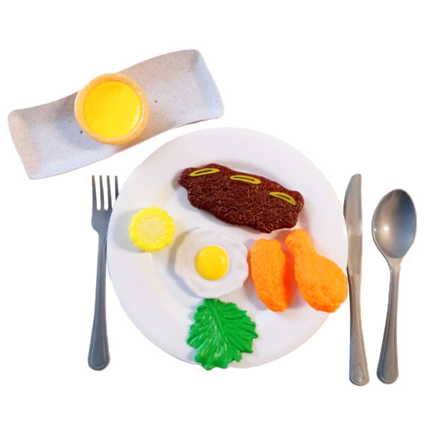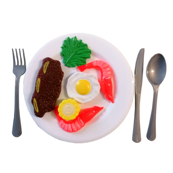 - Kiváló minőségű anyagok: A játék tányérokat, evőeszközöket és ételeket magas minőségű műanyagból készítették, amelyek garantálják a hosszú élettartamot és a biztonságos játékélményt.