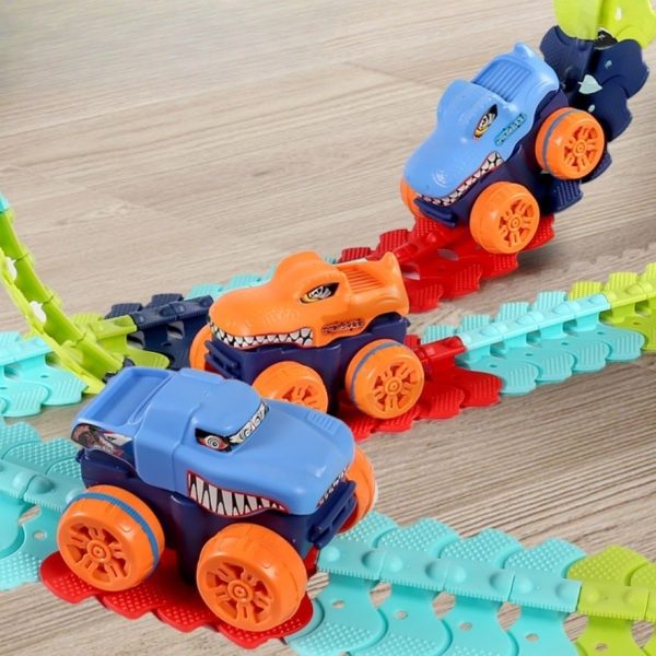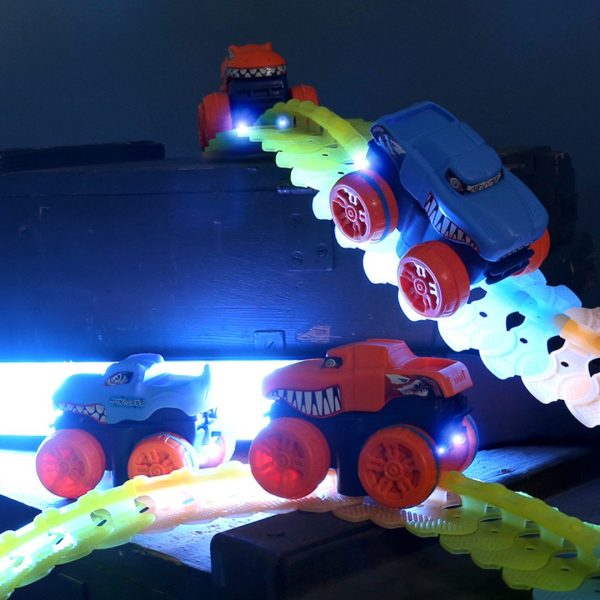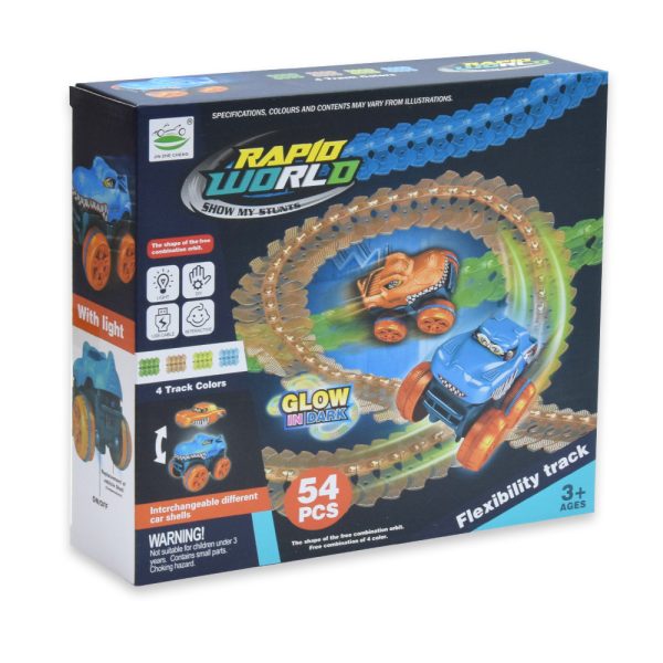 54 részes, kreatív, többféleképpen összerakható autópálya gyerekeknek 2 db dínós kisautóval – világít a sötétben (BBJ)