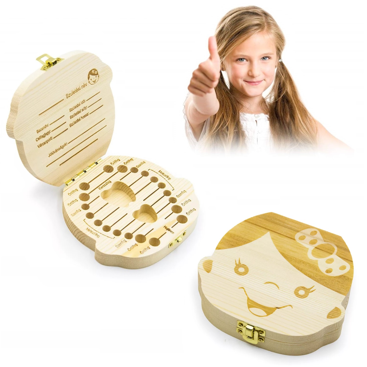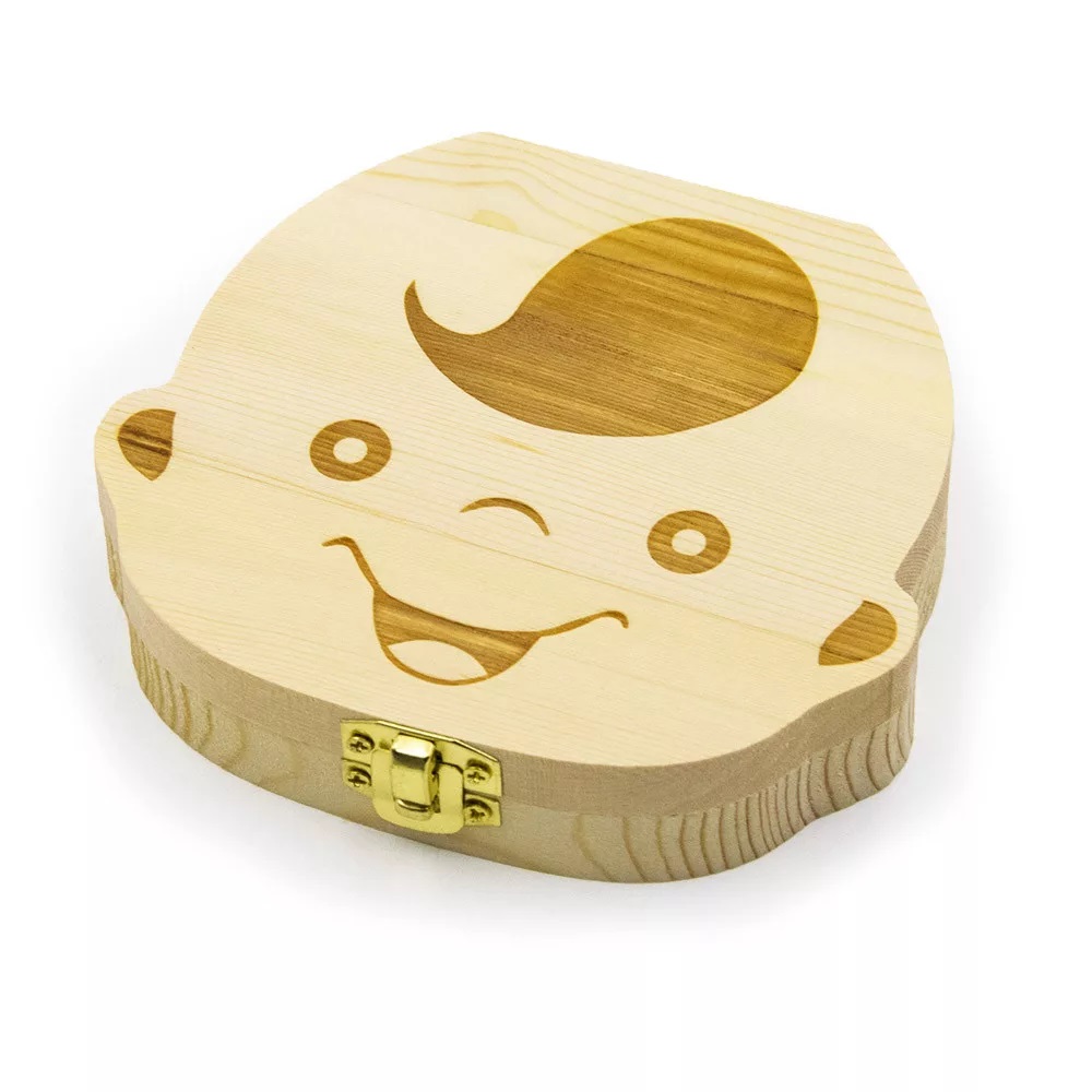 • Fa díszdoboz: A tartós és természetes anyagú doboz egy mosolygó babafejet formáz, amely azonnal elvarázsolja a kicsiket.