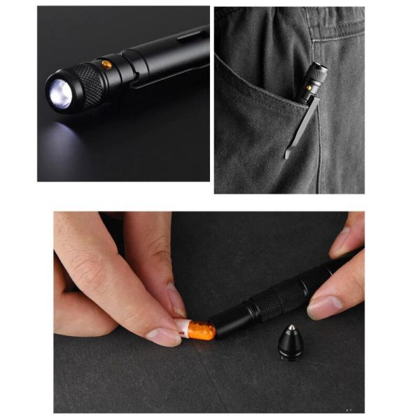 Masszív, fém házba épített, számtalan funkciót kínáló, kis méretű, kompakt taktikai túlélő eszköz. Mérete alig nagyobb egy hagyományos golyóstollnál, tudásban viszont messze felülmúlja azt! Találhatunk benne üvegtörő kalapácsot, lapos- és csillagcsavarhúzót, sörnyitót, vészhelyzeti sípot, többfunkciós zseblámpát fókuszálható fénnyel, valamint golyóstollat. A kis eszköz egy praktikus övcsipesszel van ellátva, így könnyen rögzíthető ruhára, táskára. A beépített LED lámpa körülbelül 0.5W teljesítményű, működtetéséhez 3 db LR44 típusú gombelem szükséges, melyet a csomag tartalmaz.